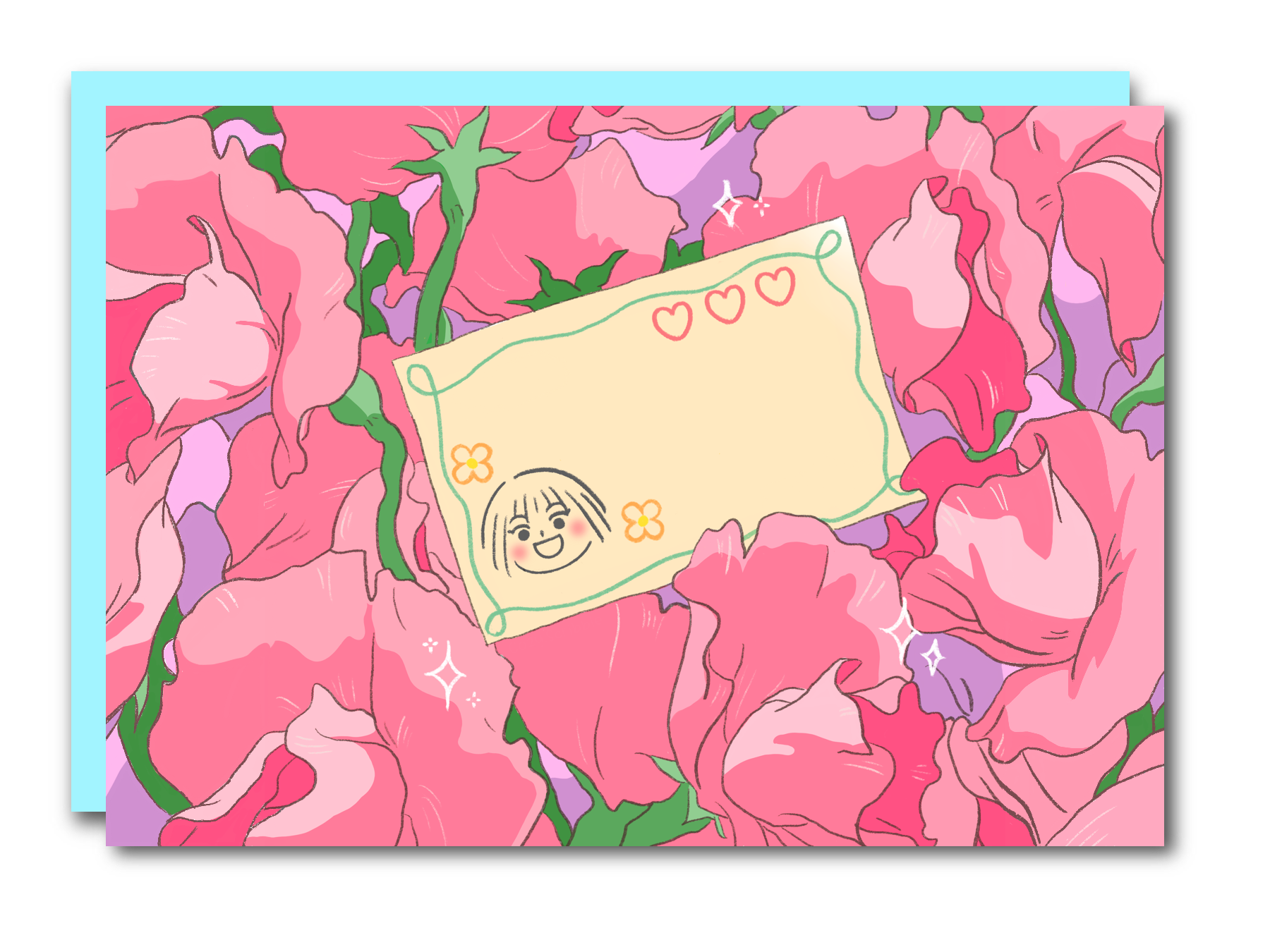 These greeting cards are printed on thick premium matte paper with water-resistant inks, keeping colors rich and vibrant for years. Each card is folded and comes with your choice of a pink or blue envelope.